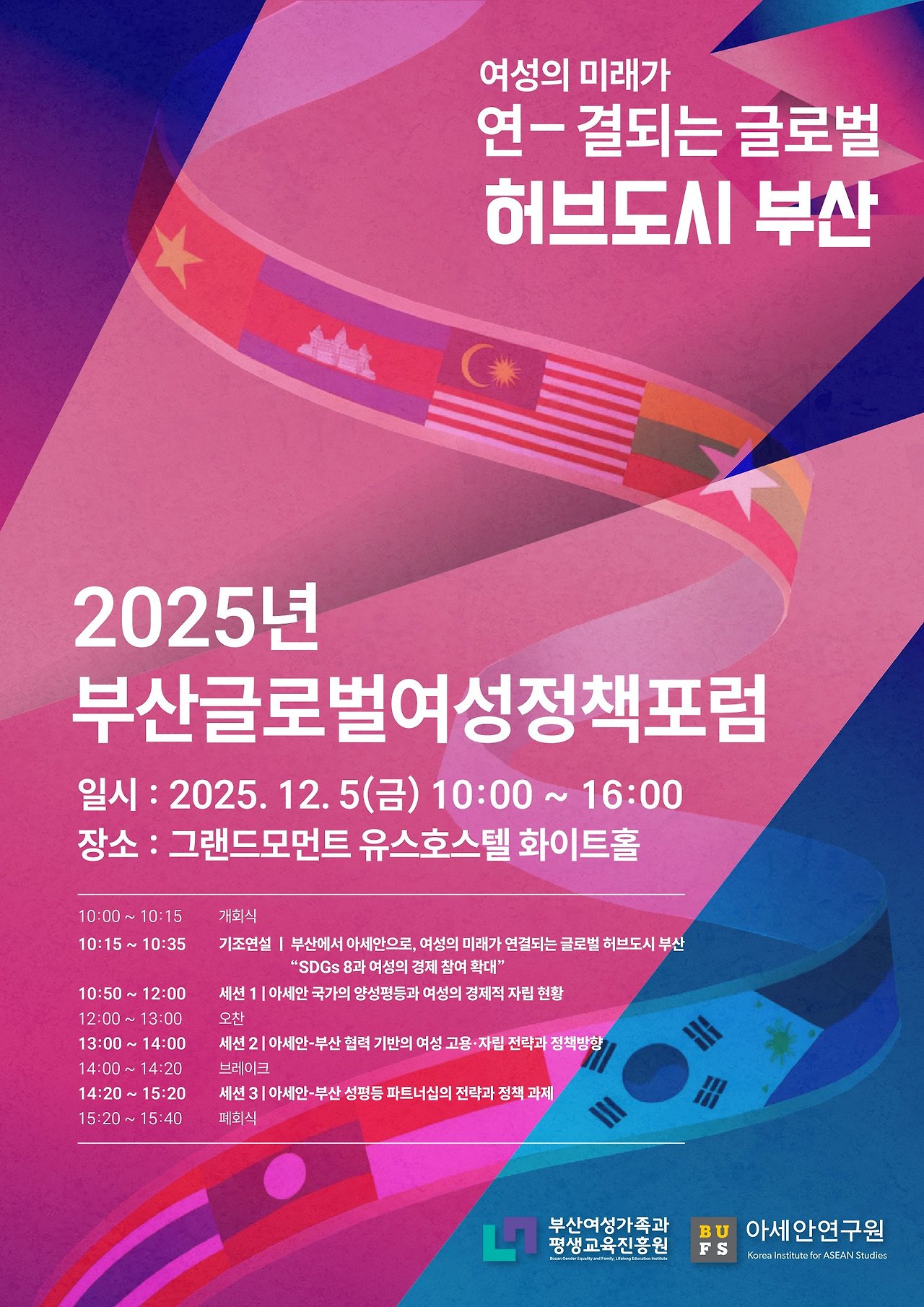 부산여성가족과 평생교육진흥원은 아세안과의 협력을 기반으로 여성의 미래를 연결하는 글로벌 허브도시 비전을 주제로 2025년 부산글로벌여성정책포럼을 개최합니다.